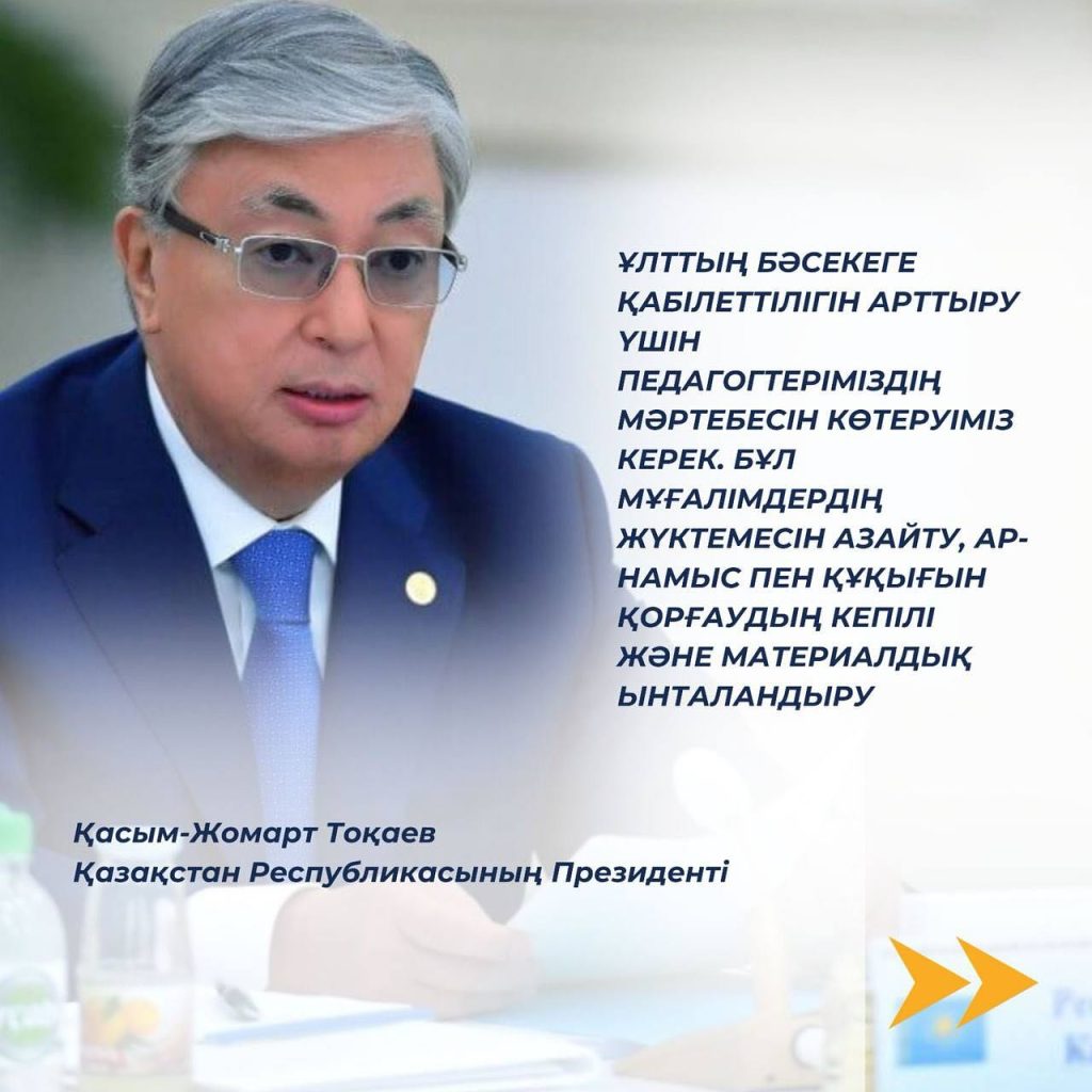 2019 жылы «Педагог мәртебесі туралы» ҚР Заңы қабылданды, ол педагогтердің жалақысын көтеруді, тиісті функцияларға сәйкес келмейтін жүктемелер мен тексерулерден босатуды, педагогтердің әлеуметтік мәртебесін арттыруды, оқу жүктемесін қысқартуды, еңбек демалысын ұзартуды және педагогтар үшін өзге де ынталандыруды белгілеуді көздейді.